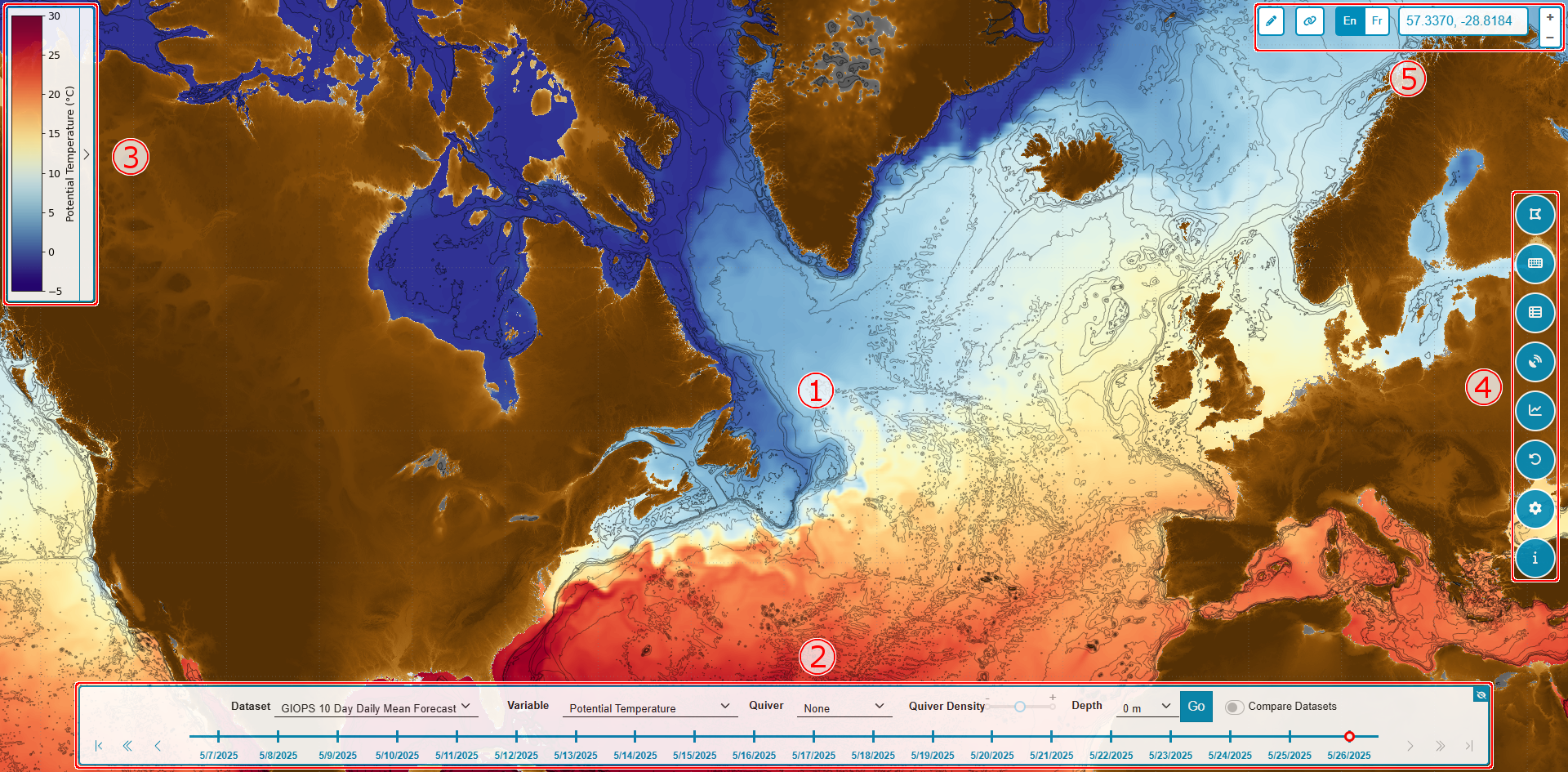 The global map is the most prominent way to visualize oceanographic forecast models in the Ocean Navigator. The default view is centered on the North-West Atlantic but users can pan over map clicking and dragging at any point. Users can also zoom in or out using their mouse wheel, laptop touchpad, or by using the zoom buttons in the Additional Options area.